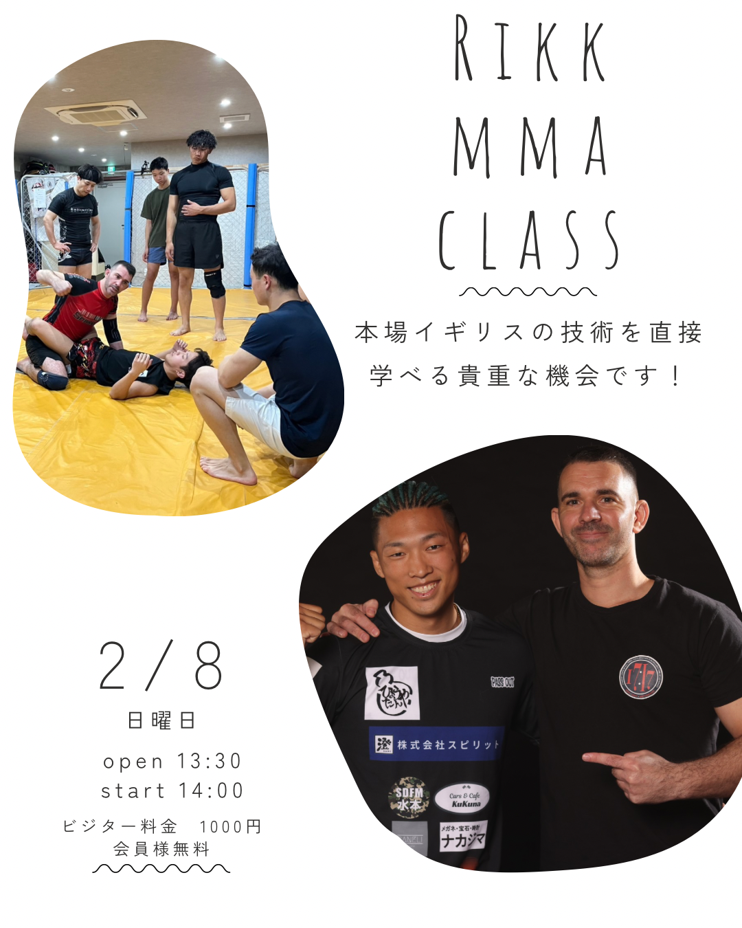 皇子山MMAから、スペシャルワークショップのお知らせです! 2月8日(日)、イギリスの本格的な技術を直接学べる「RIKK MMA CLASS」を開催いたします。